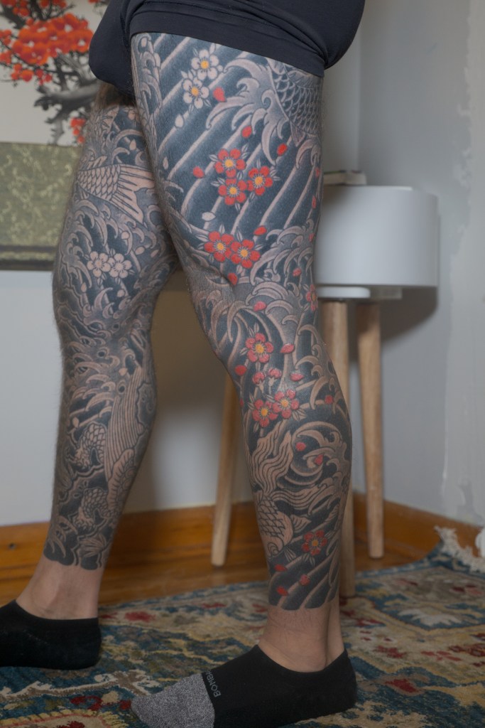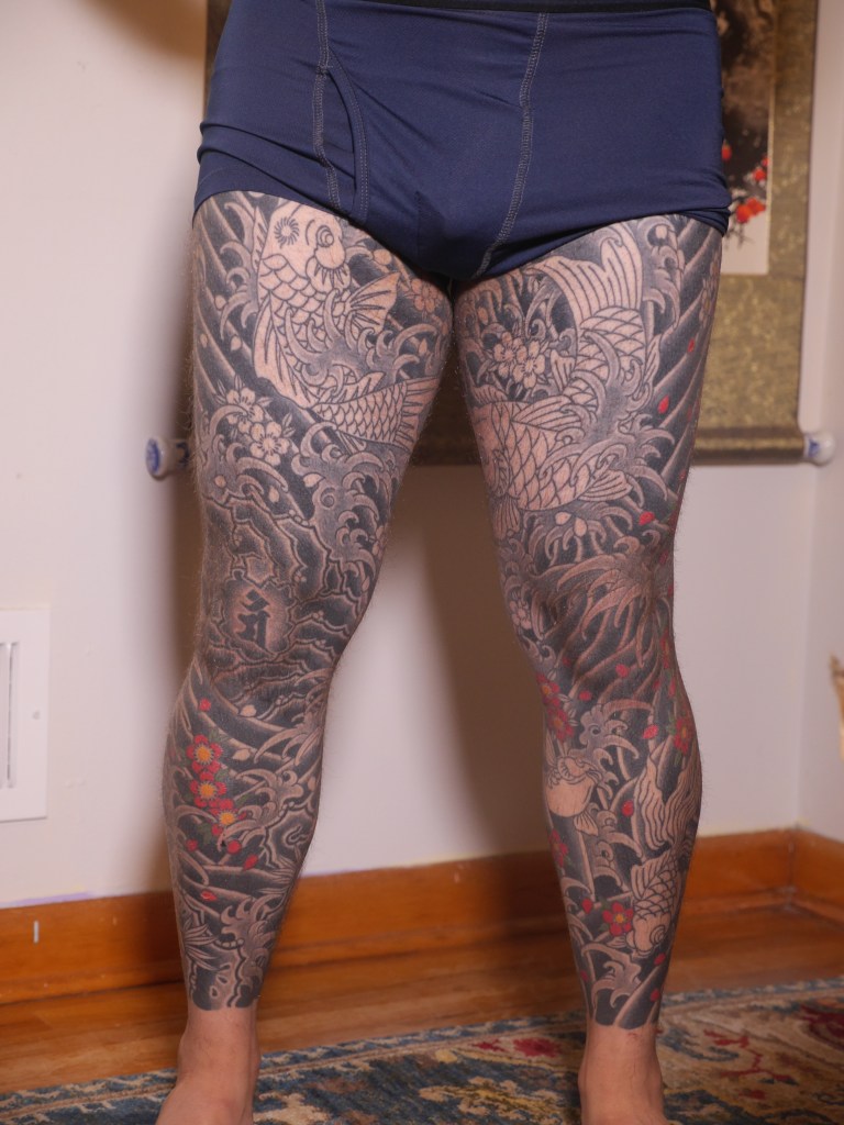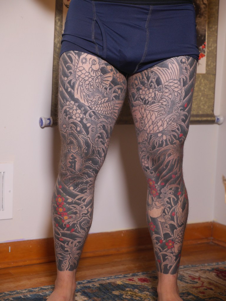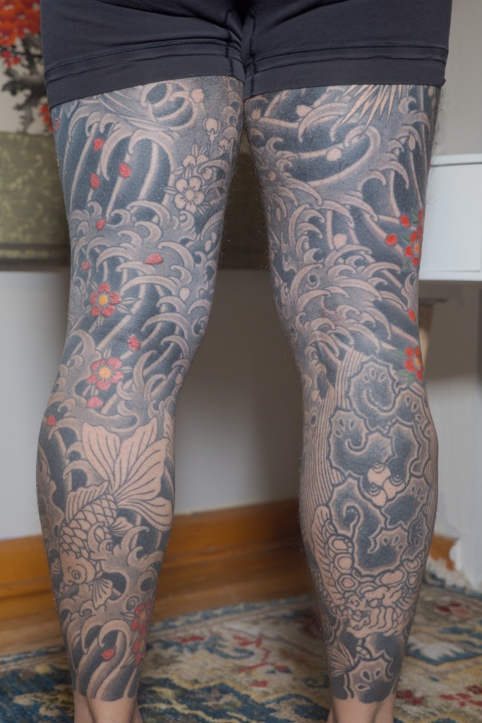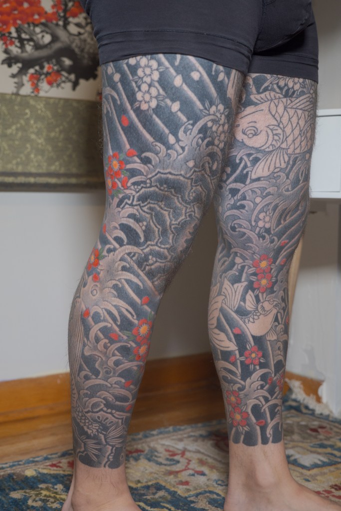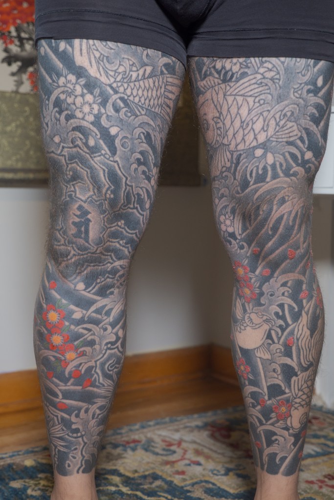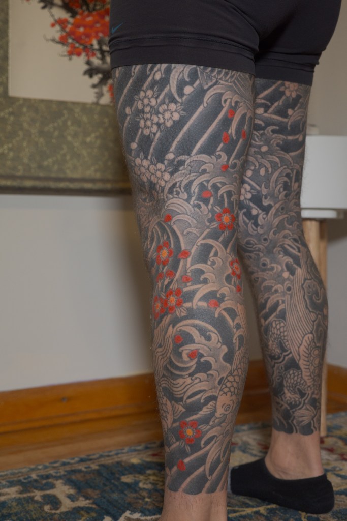 I’m sure there’s a handful of other thoughts that are escaping me now, but I’m sure I will bring them up in another post as they come to mind. Until then, to summarize the last two months: Horizakura tattooed me for 8 hours over the last 4 appointments (appointment numbers 149 – 152) during which he continued to fill in the cherry blossoms on my legs.