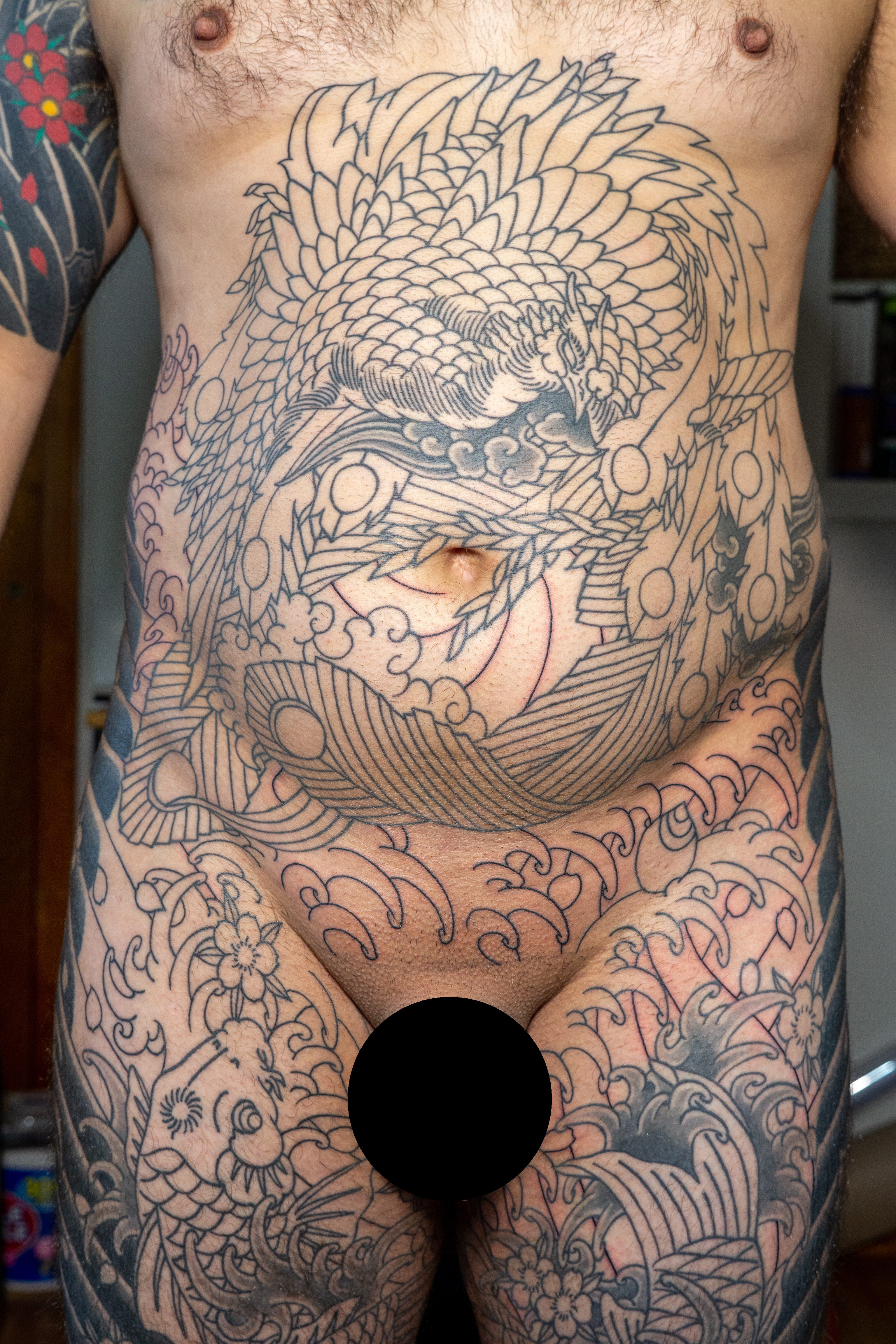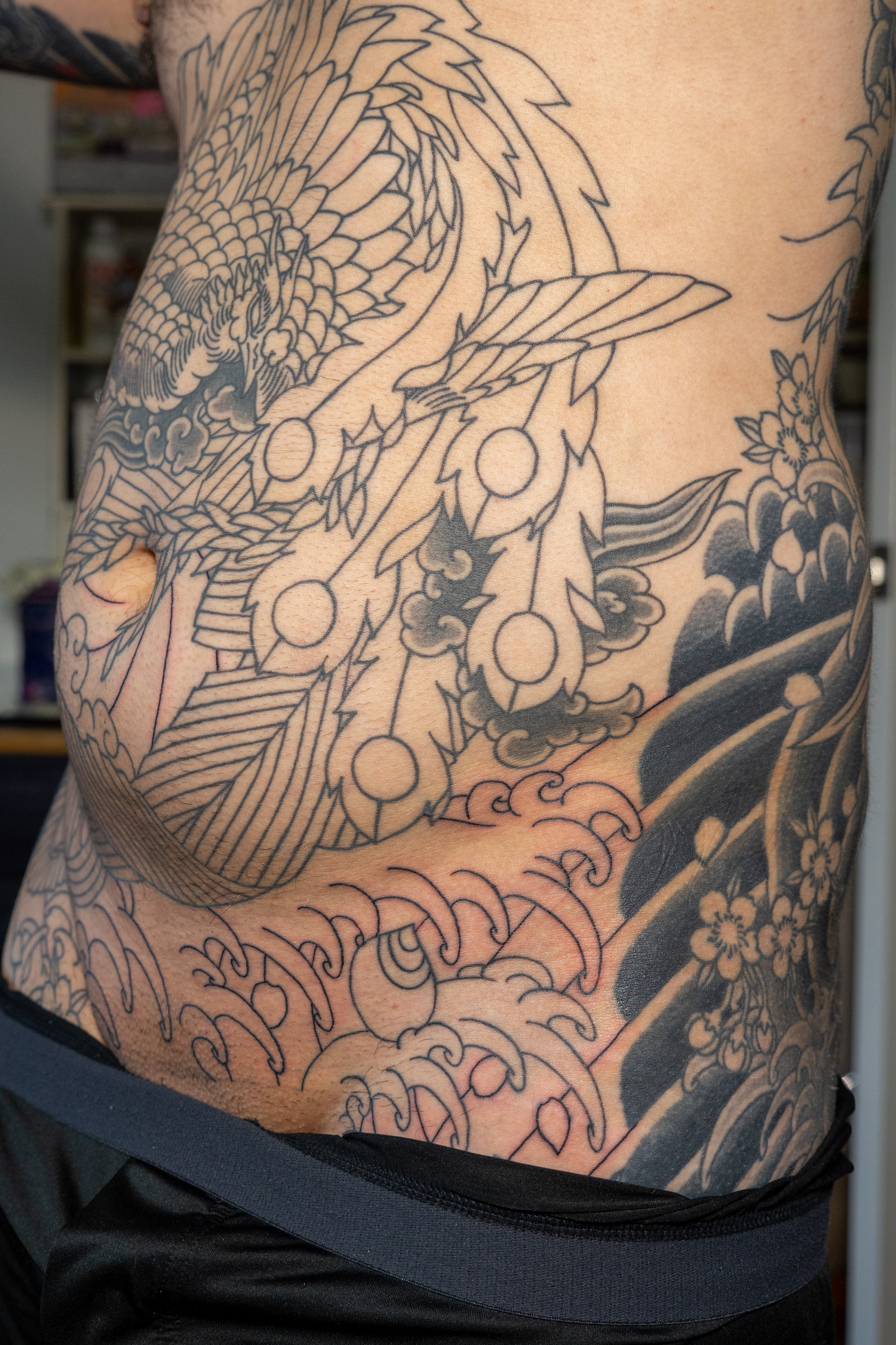 My 79th appointment with Horizakura marked a return to shading all the outline that has been added since we were able to start up again in July. My dream of finishing the outline of the tattoo was left to die on the vine as Horizakura still wants to consider the elements of my left arm and ribs/chest. My instinct is to charge forward and his is to slow down and hold back. That’s pretty much how it has always gone with us, and it’s worked out pretty well so far. Who am I to get in the way of the process?!