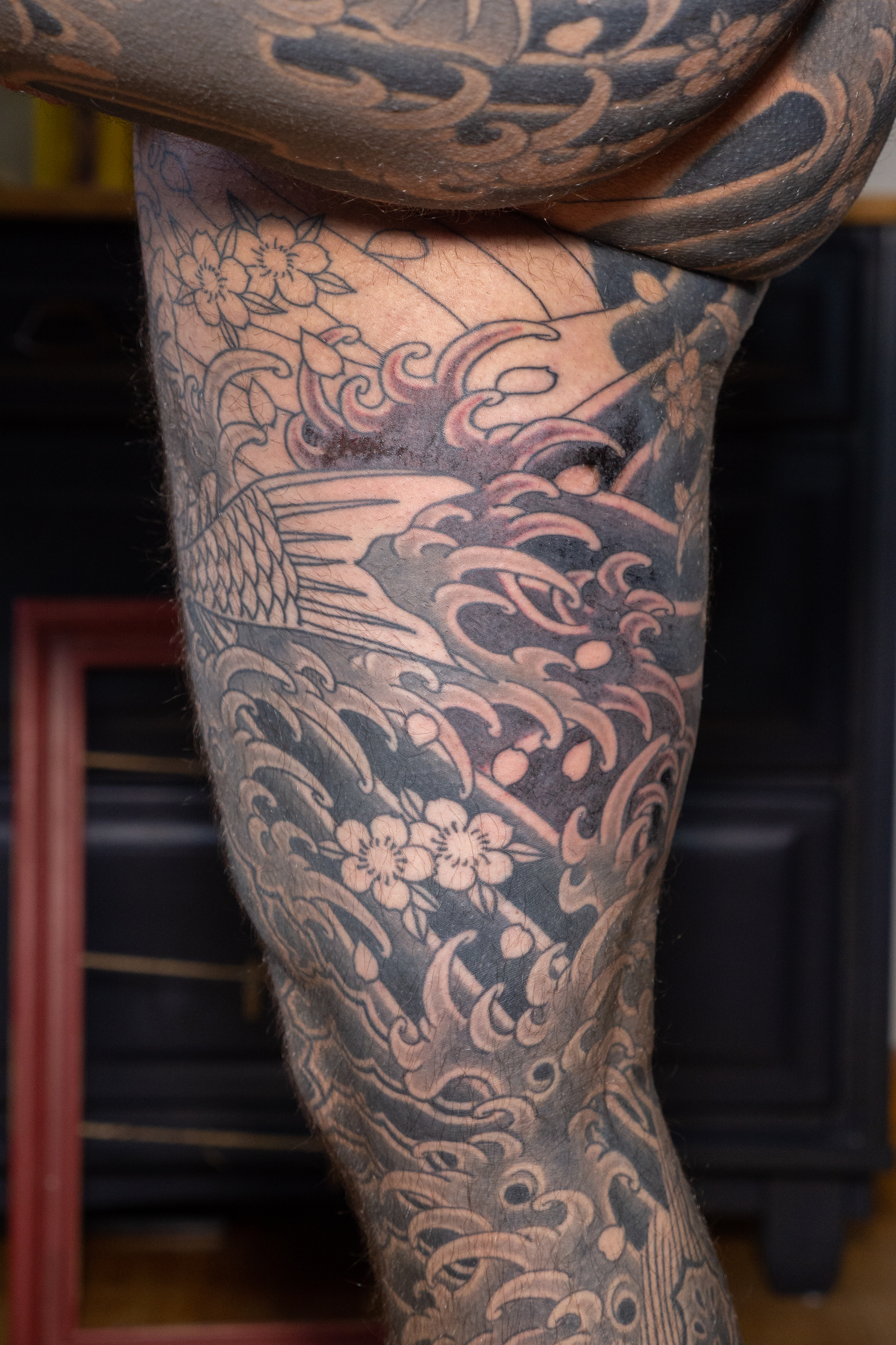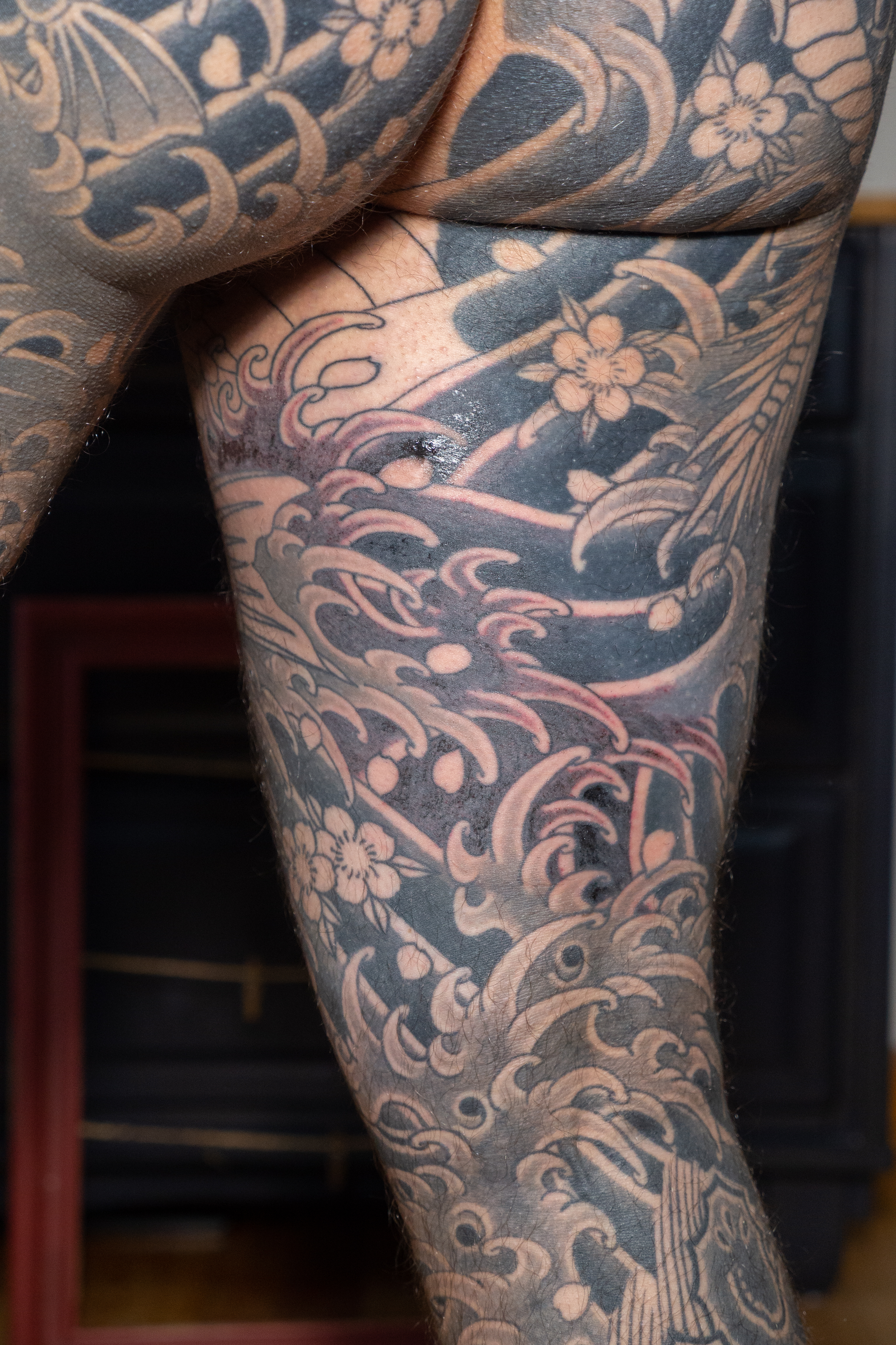 ANYWAY. All that preamble was just to say that for the next 8-10 appointments (I’m totally guessing here), this will be the All Tebori, All the Time Blog. No particular notes here. He spent an hour and a half shading the background of my right inner thigh. Not a bad area to be tattooed in my opinion. It’s nice to be back to the quiet sounds of tebori. I know for a lot of people the sound of a tattoo machine fills them with excitement, but having experienced a fair amount of both, I have to say the peace and quiet of tebori is far superior.