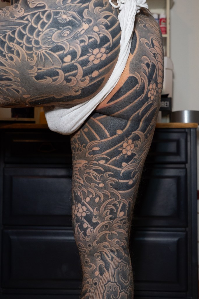 My 83rd appointment with Horizakura started off pretty similarly to my 82nd appointment. To his credit, he tried to get me into several different positions to best access the area that needed to be tattooed, but none of them were giving him the space he needed to work. He determined that my least favorite position would be the best solution. Thus I found myself once again laying on my back, holding my left leg over my head. It didn’t last too long, but any amount of time in that position is enough for you to be happy when it’s over. Afterwards, I was in a bit more of a neutral position with my left leg kicked out to one side so he could continue to shade my inner left thigh. My right foot was flat on the table with my knee bent. Quite comfortable. Until the cramping began.