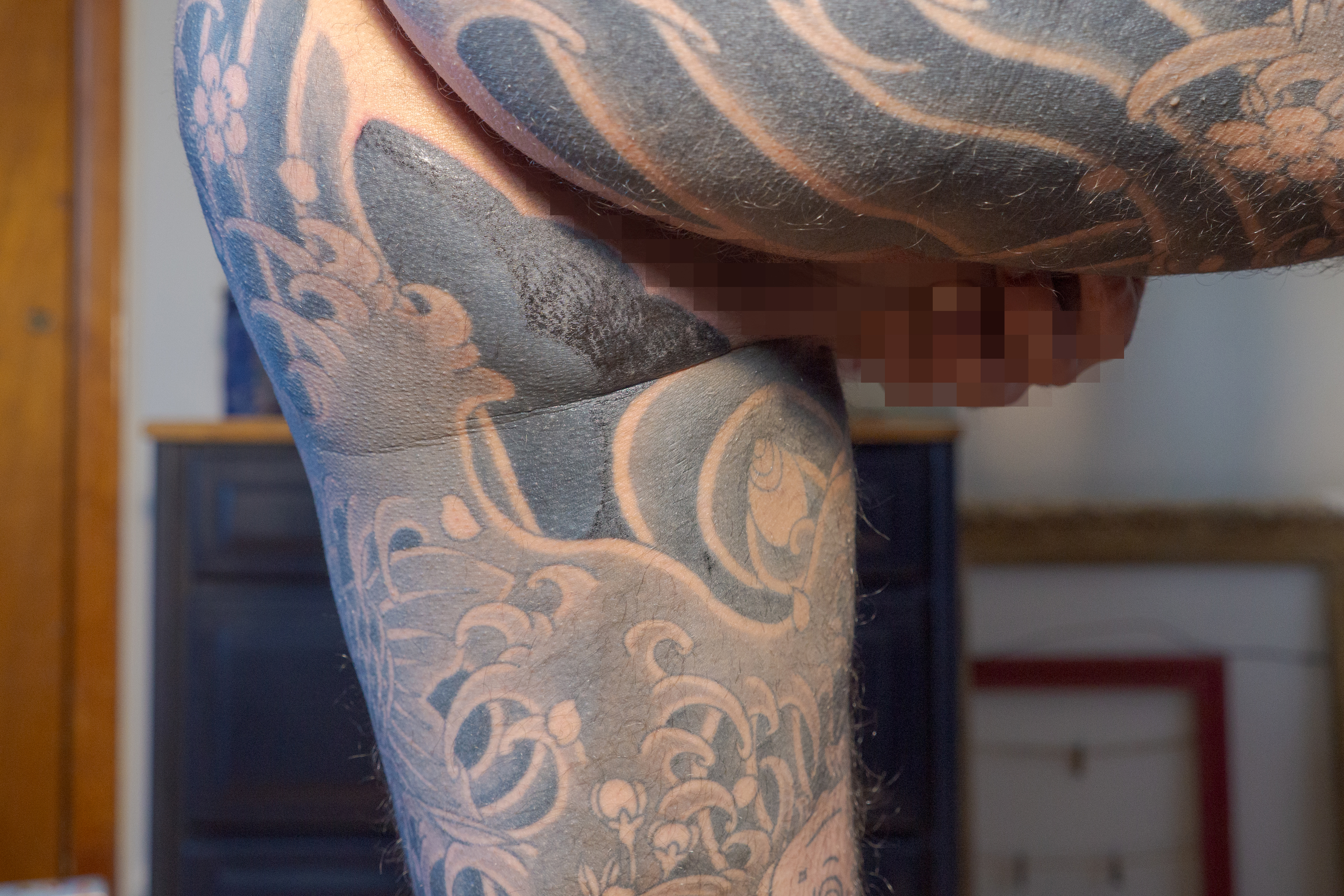 After a cancellation because of inclement weather, Horizakura and I were finally able to meet for our 86th appointment. Without any further preamble, I am delighted to say that he has finished shading the background on the deepest edge of my butt cheek/inner thigh. Regular readers will recall that this particular area is among the worst to experience, not because of the pain, but because of the undignified position required for the artist to access that area. For 30-45 minutes, I held my leg in the air while he tattooed this final bit of skin. Even though we have reached a very real comfort level with each other, there is no world where this position is comfortable, and I am delighted to be done with it. The remainder of the appointment was spent tattooing over my left hip area.