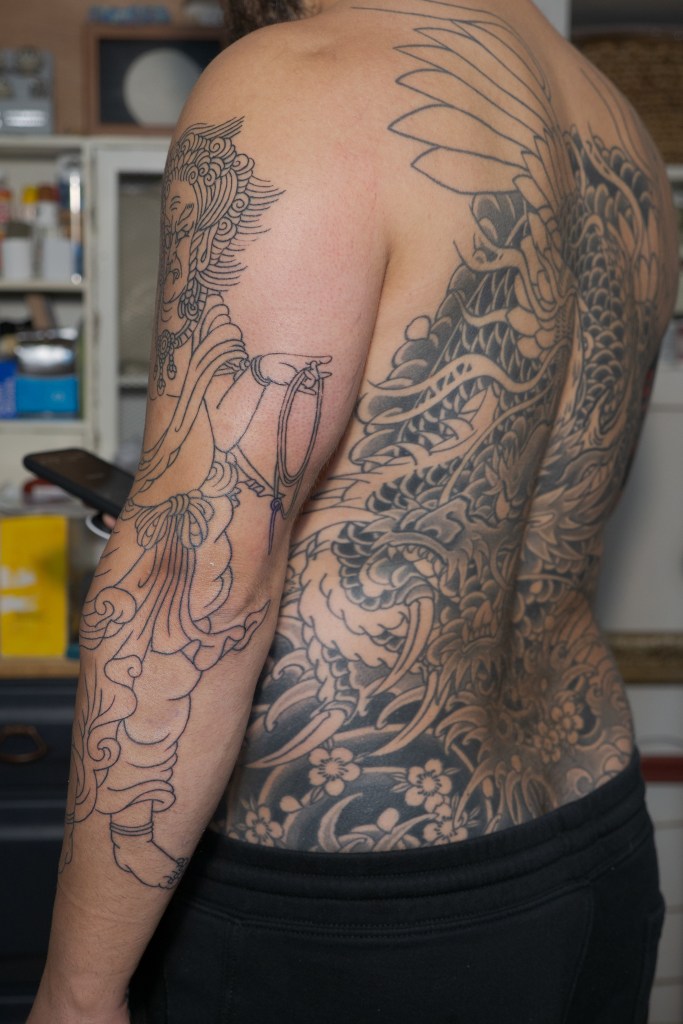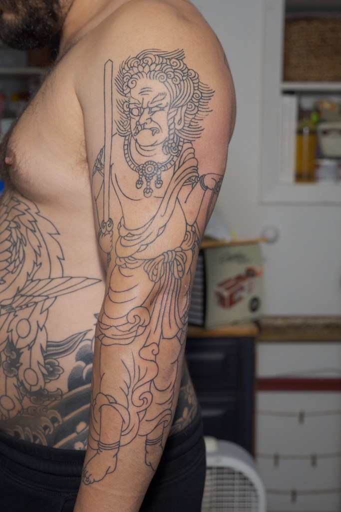 This post will cover work done during appointments 91 and 92. Horizakura spent these appointments outlining a standing Fudo Myoo on my left arm. Normally I would post immediately after an appointment, but because he was only able to complete Fudo-san’s upper half during appointment 91, he asked that I not post anything until the entire figure was outlined. If there is one thing that has really developed in me during this bodysuit process, it’s my patience. I’ve always been fairly patient with people, but being patient with myself or the things I’m excited about isn’t always so easy. In light of that, it wasn’t too much to ask that I be patient with making this post.