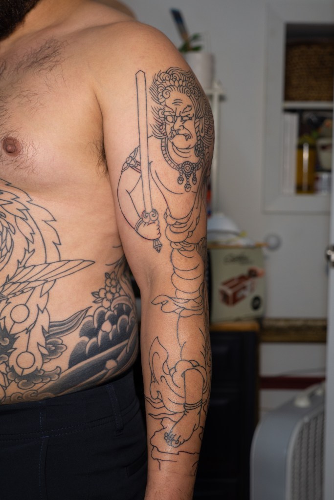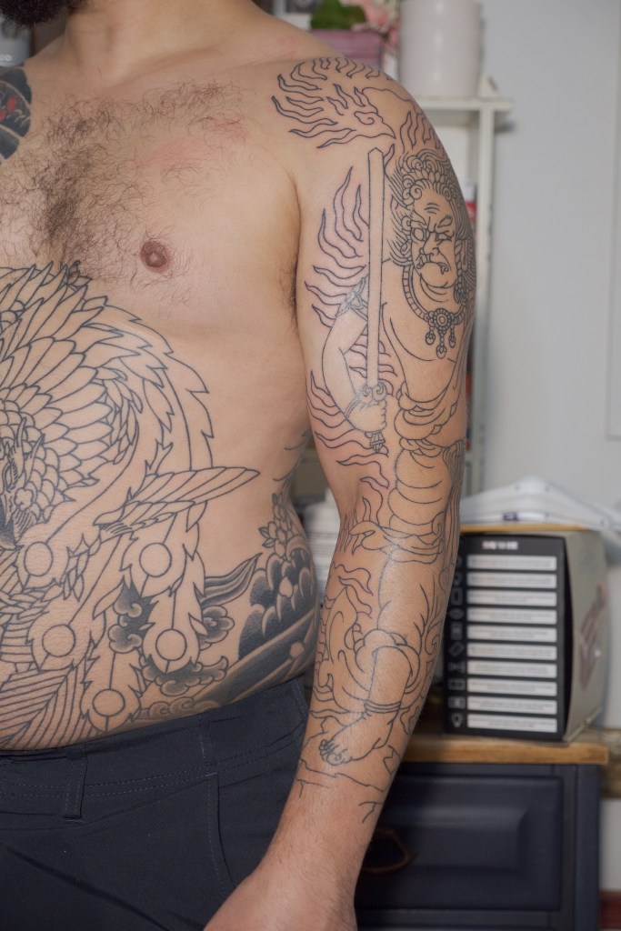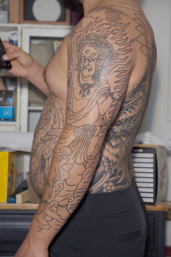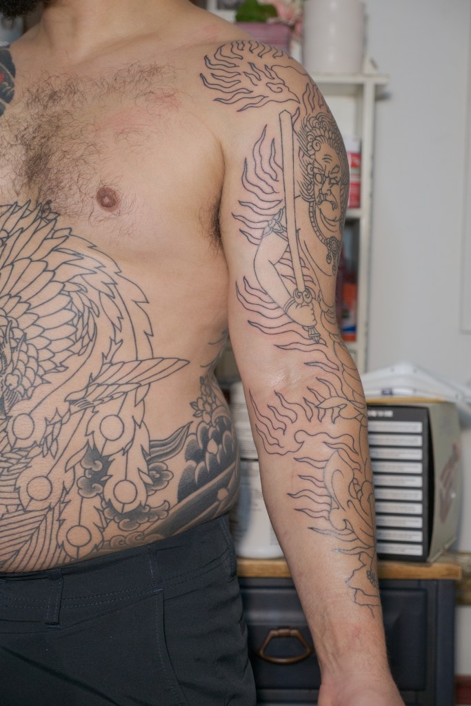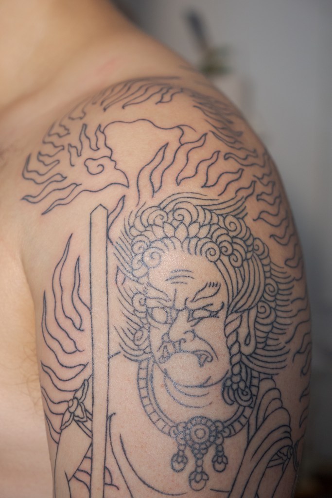 The outlining continues! My 94th appointment with Horizakura was 1.5 hours of outline around the Fudo-Myoo on my left arm. He continued the halo of flames on my inner arm and added the “head” of the Karura Flame on top of my shoulder. Longtime readers may remember that I offer very little input on the process. With the exception of a couple major pieces I have mostly let Horizakura design the whole tattoo on his own. This appointment was no different in that respect, but it was unique in another way. As he was designing the Karura Flame on my shoulder, he started having a conversation with his apprentices (who were observing) about the design. Mind you, all of this was in Japanese, so besides one or two words, my whole understanding of the exchange was from body language. The most interesting part about this was that this didn’t really seem to be Horizakura teaching his apprentices what he was doing, but more of an open dialogue about the design. It went on for maybe 10 or 15 minutes. He drew on me, they discussed, somebody made a suggestion, they drew an example on paper, he made some changes on me, and they discussed some more. At one point an apprentice even gloved up and drew on me a little, then more changes and discussion. The whole exchange was really fun to be a part of. I’m sure it would have been even cooler if I understood Japanese. While this was going on, I reflected on this part of the master – apprentice relationship. I don’t claim to know very much about the way a tattoo apprenticeship normally goes, much less a more traditional Japanese apprenticeship, but this particular interaction was much more of a two-way street than I would have expected. I suppose it shouldn’t come as too much of a surprise as I know lots of tattoo artists will trade off working on the same drawing to play off of and learn from each other. I found it interesting that this back and forth was happening regarding a client’s tattoo. I wonder if a more particular client would be adamant about the artist they selected being the one to design the piece. It didn’t bother me at all that other people in the room (be they apprentices or otherwise) were having input on the process, that sort of community feedback can be a big part of art in general. I thought it was pretty awesome to be a part of, I’m glad it happened.