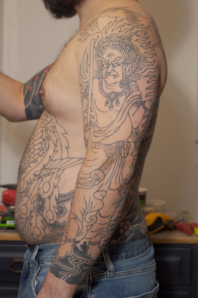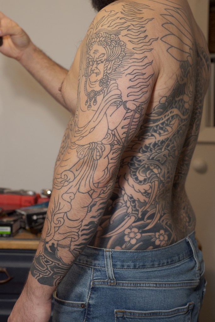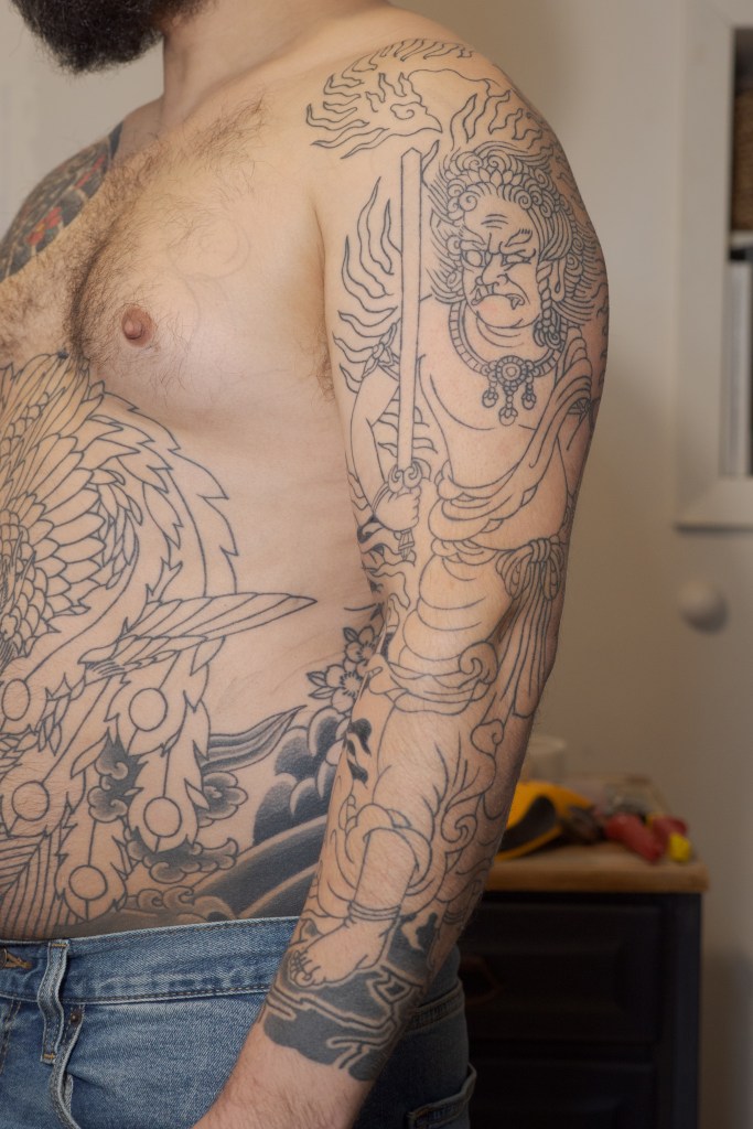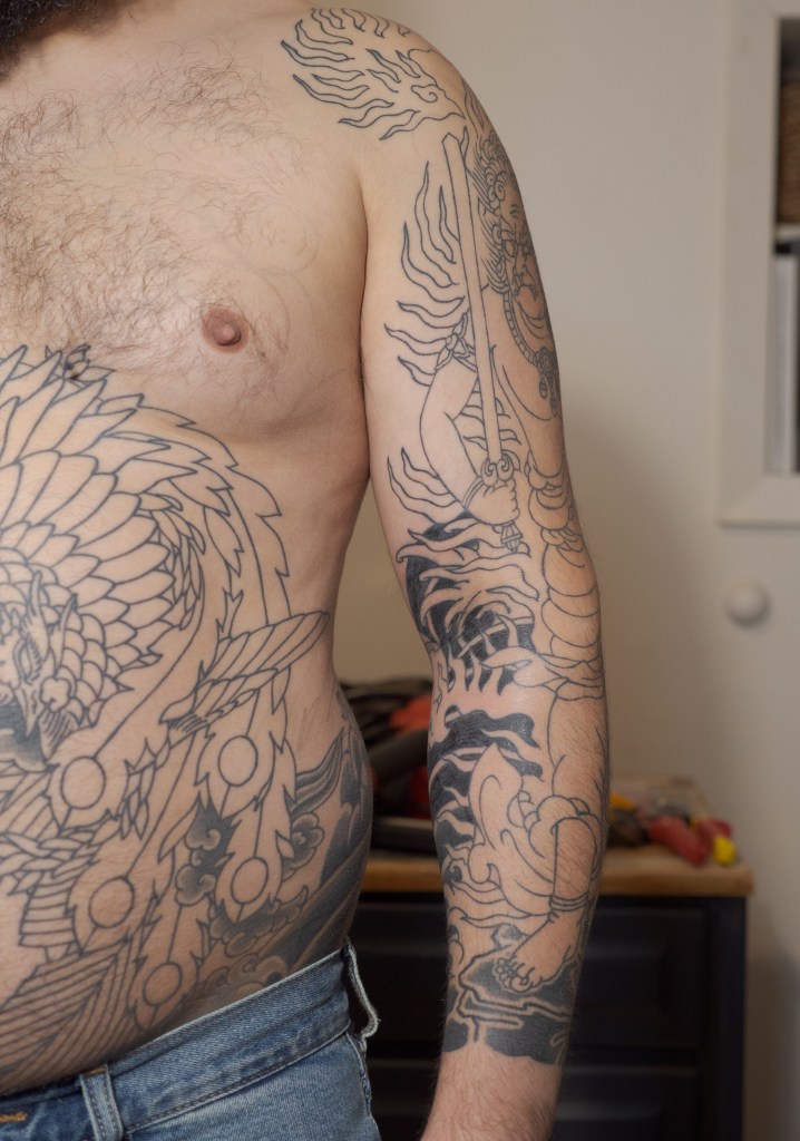 My 99th appointment with Horizakura was very similar to my last couple appointments. So much so that I’m not sure I have anything to really say here. He spent about an hour and a half shading my left forearm/elbow ditch. Tebori is much more gentle on thin-skinned areas like the ditch, so it wasn’t bad at all for me. I actually nodded off a couple times which I don’t recall happening since we were tattooing my thighs. I try not to do that if I can help it but it’s just so damn relaxing sometimes. That’s all I’ve got for you today. Look at these pictures.