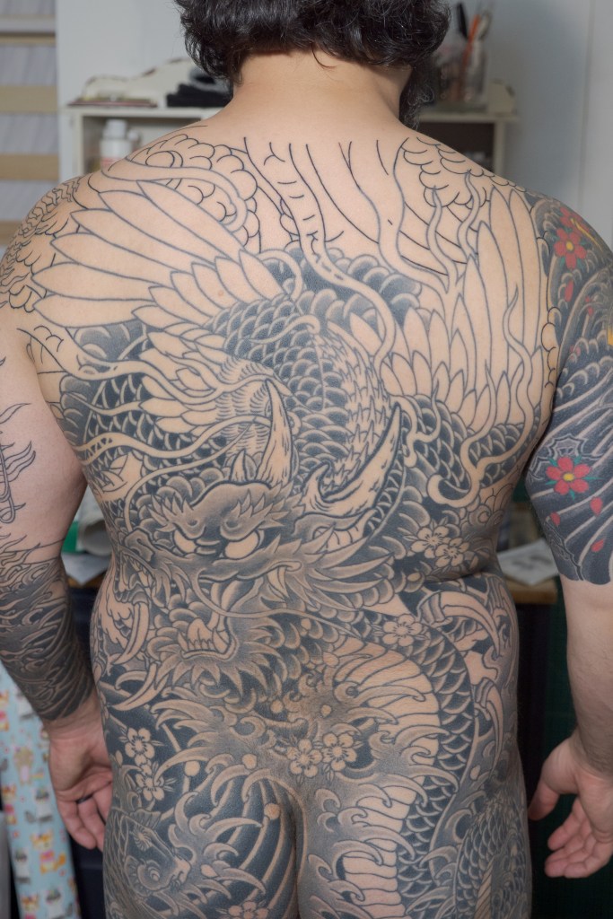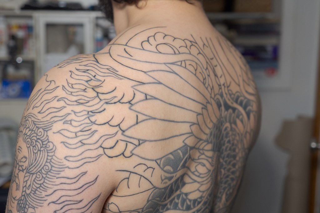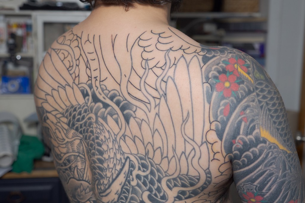 My 102nd appointment with Horizakura was an hour of outline over my shoulders/upperback. It’s funny to think about it, but we have finally finished the outline of my backpiece after starting it over six years ago. Long time readers may recall that after we finished shading in what had been outlined of the backpiece, Horizakura wanted to begin with my sleeves in order to properly join everything together at the shoulder. A conversation about full sleeves vs 7/10 sleeves eventually lead to the decision to start on my legs instead. The backpiece was put on hold and he started from the bottom and began to work his way up, which is what we have been doing ever since. Starting from the bottom like that has always made me feel a little bit like a glass or cup that is being “filled” as we go. Not a very big cup. I’m short. Less of a pint glass and more of a tumbler. Now my glass is almost full and it is very exciting.