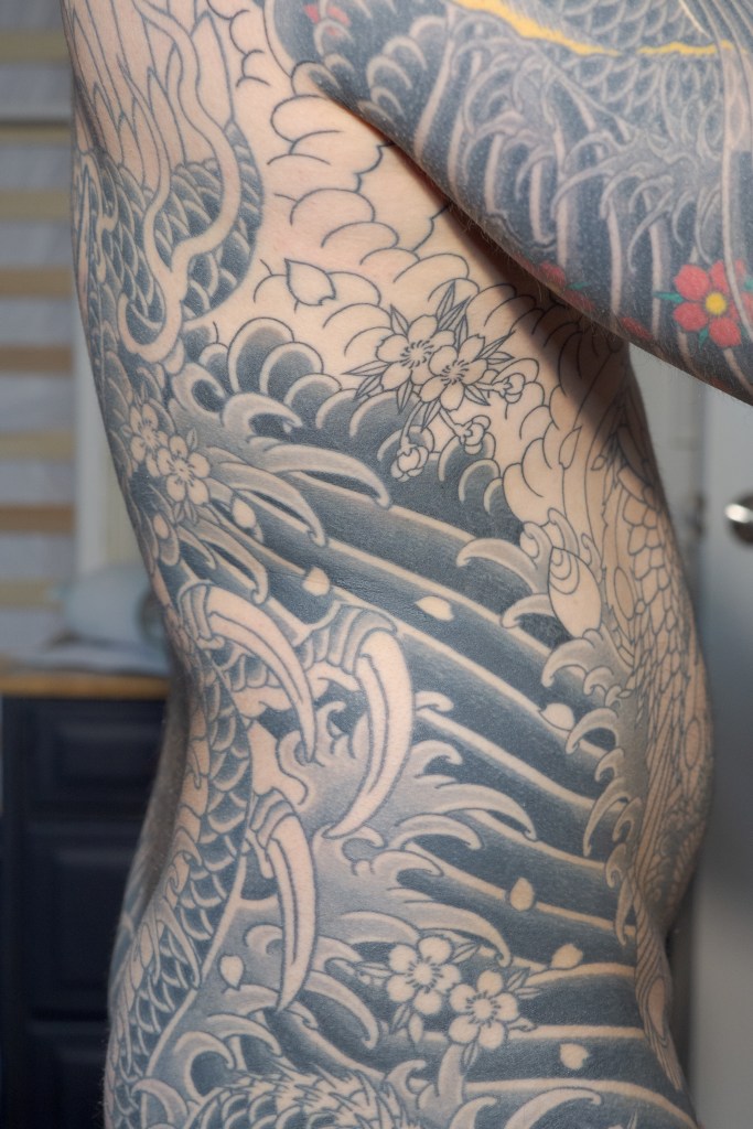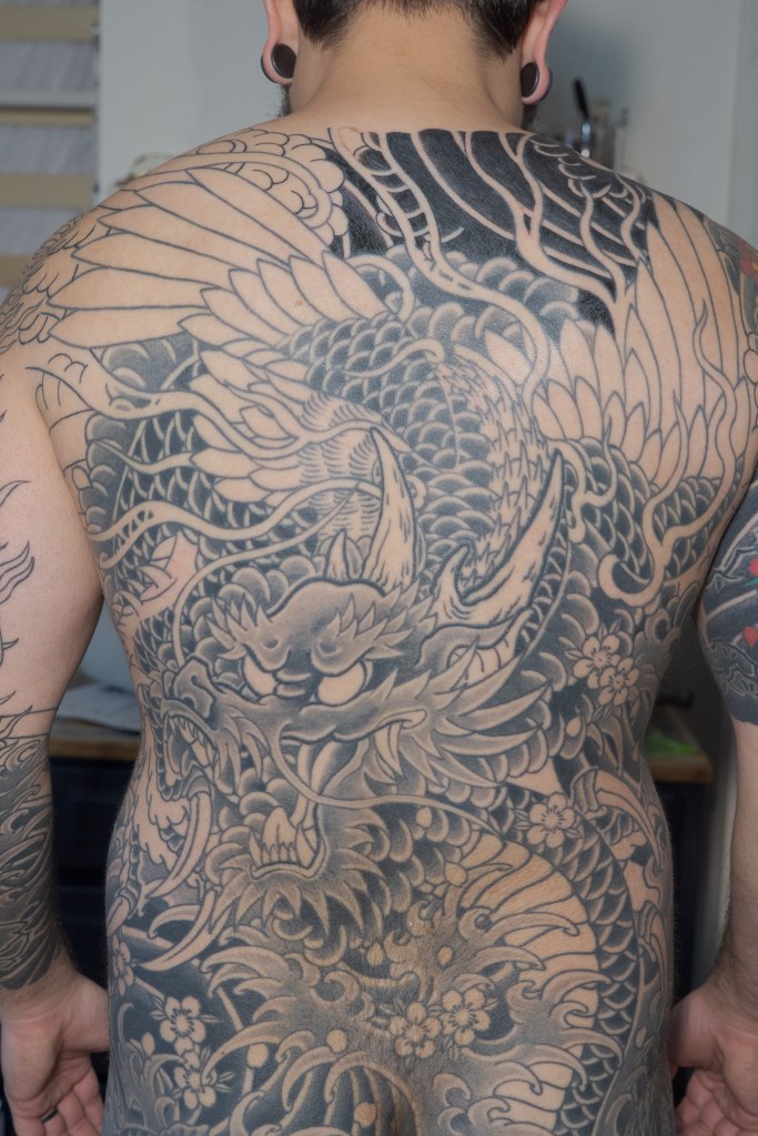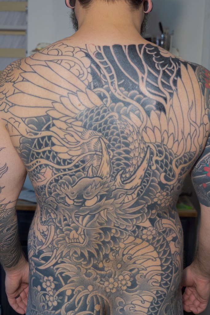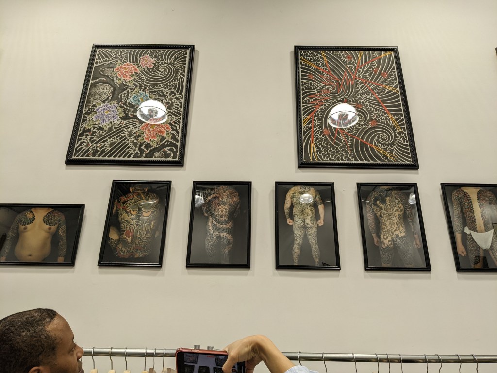 It’s been a hot minute since I’ve had a non-tattoo update. I know last post I made some sort of vague promise about reading books. Let’s be real, me having the time and energy to read a book may very well be a pipe dream. Instead, you will get these photos from the event and you will be happy with it. For context, Horizakura had arranged to hang several pieces of art for sale in the store. The display also includes a short biography as well as a line of photos of more recent clients (including yours truly). The event was well attended by friends, clients, and other tattooers. In all the time that I have been getting tattooed by Horizakura, this was the first time I was afforded the opportunity to really engage the with the tattoo community that surrounds him. It is, perhaps, the only drawback to getting tattooed in a private studio setting. I love everything about it, but the interaction with other clients as they come and go just isn’t there. It was a true pleasure to be able to meet and talk with other clients or tattoo enthusiasts in person. I also really appreciated those of you I met that had kind words for me about Gaijink. Selfishly, I really do this for myself so that I can remember the journey. I would do it even if nobody read it, but knowing that people do is really encouraging to me.