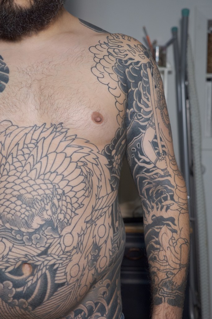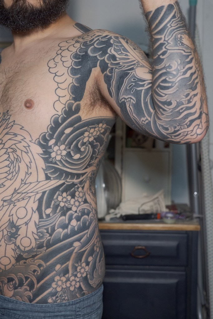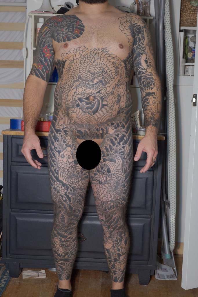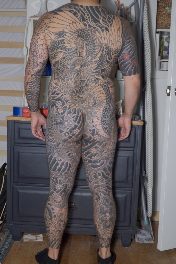 Before we get to the photos, I would like to take one last moment to thank Horizakura, Monji, and Haru for the hard work and contributions they have made to my tattoo. It’s easy to forget how lucky I am to be able to actively pursue this bodysuit. I would like to thank you all (there are dozens of us! dozens!) for the time you spend reading my blog or interacting with me on Reddit or Instagram. I’m grateful for all of your kindness and for having people along for the ride with me. This blog and talking to all of you has been a great way to fill in the time when I haven’t been able to get tattooed or if I’m simply in between appointments. Lastly, I want to thank my wife for her continued patience with me while I chase this dream. I was really scared about how the addition of a baby would impact the already perilous juggling act of my work, house, and marriage. It seems as if my fears were largely unfounded as, while babies certainly are expensive, we have been finding a way to make it work. That is in no small part because of my wife’s efforts.