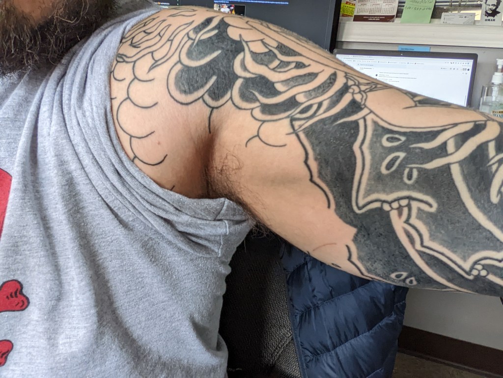 Since my last appointment of 2022 would have fallen on Christmas Day (and because I would like to stay married) I cancelled that appointment. As such, I thought now would be a good time to do a little photo dump of the whole bodysuit as it stands at the end of December 2022. This year we had 16 appointments that netted about 26 hours of tattooing. This is the most productive year we have had since 2018 (26 hours of tattooing over 15 appointments). I am absolutely thrilled to be getting more than 15 appointments in per year. I would love to be able to hit 20 appointments in a year next year!