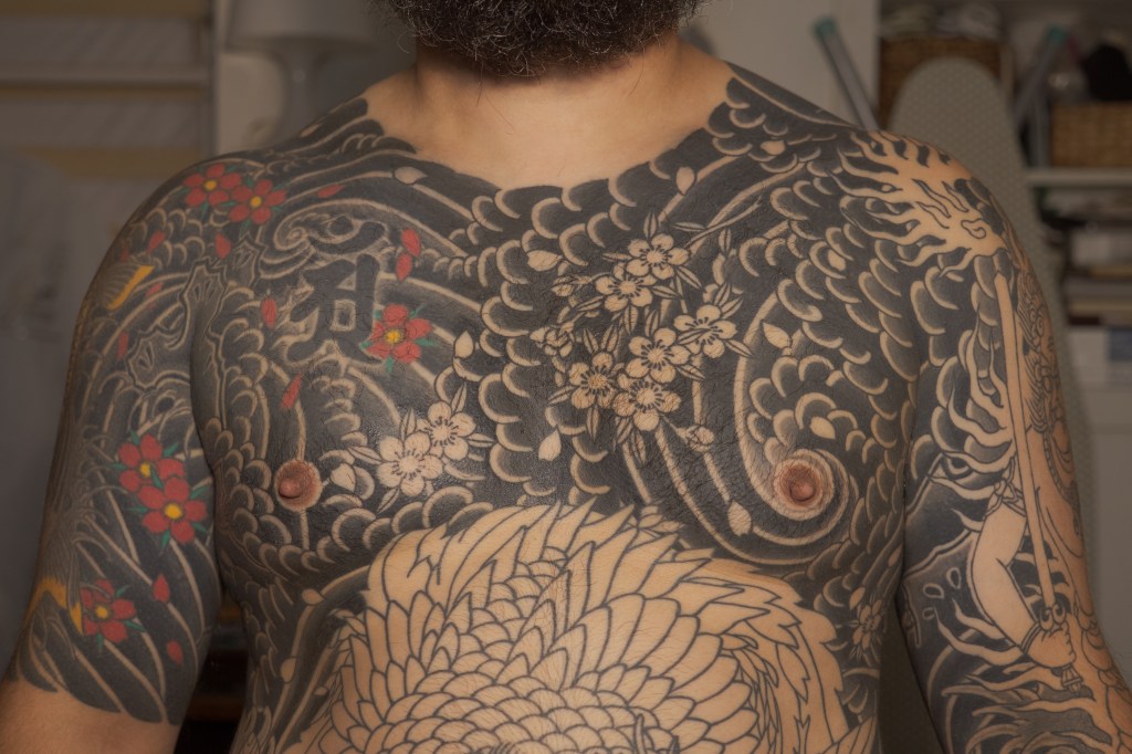 With my 124th and 125th appointments with Horizakura, we finished up the shading on my chest. All the blackwork is done on my torso. It’s truly thrilling because 1) I get a break from chest tattoos for a while and 2) we are moving on to the last portion of outline for the bodysuit. Tomorrow we will be outlining my right forearm and I am very, very excited. I’m not even sure if we’re going to stick with the original plan or if it’s going to change a bit, but finishing the outline of my bodysuit feels like a big milestone. I’m not certain that we will actually finish the whole forearm outline tomorrow, it might take two appointments, but I’m very excited nonetheless!