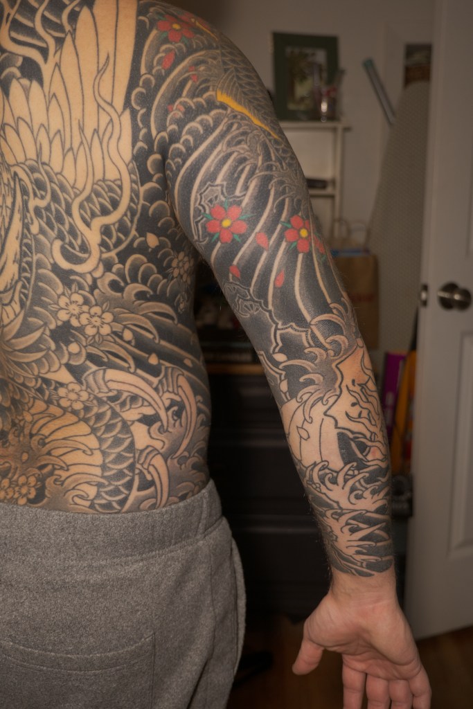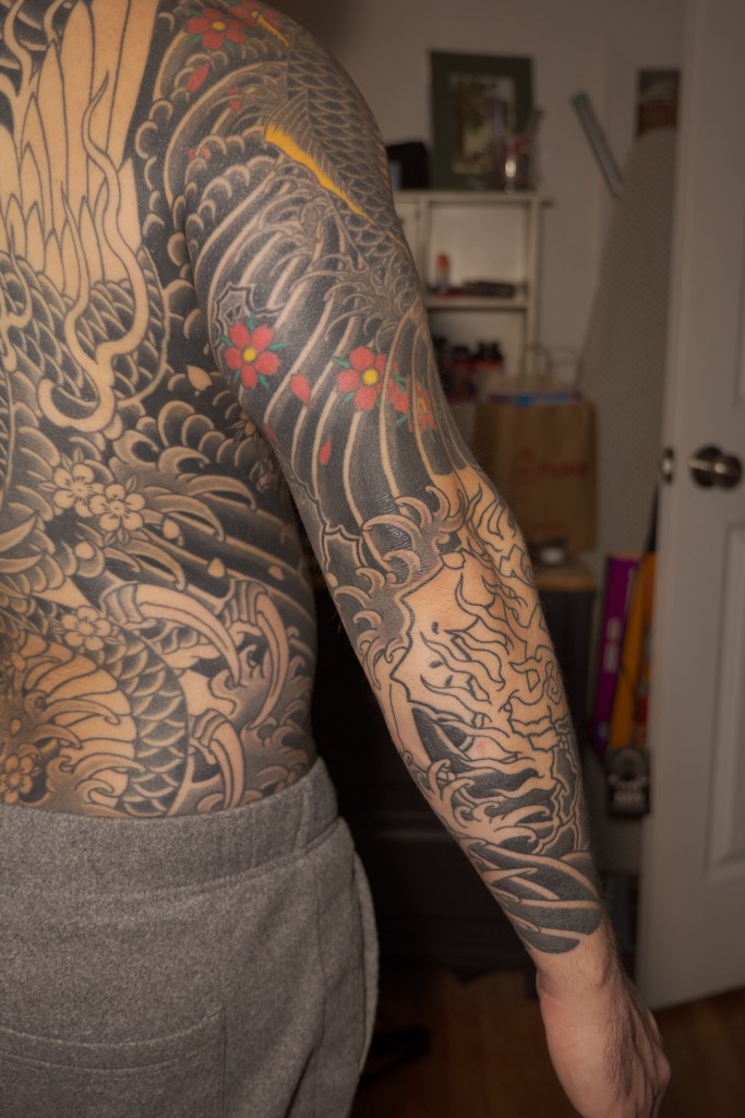 Another year of tattooing is in the books for Horizakura and me. We had a couple milestones in there. We crossed 200 hours of tattooing and finished the outline of my bodysuit. We are also maybe two or three appointments away from being finished with all the bokashi.