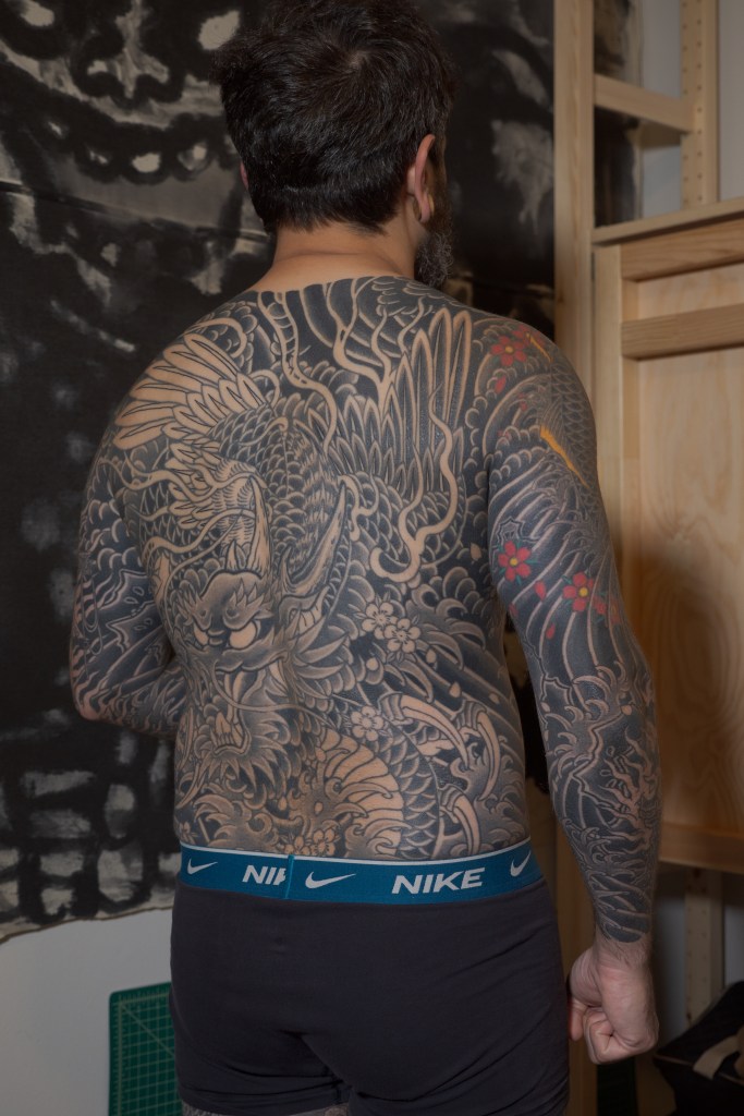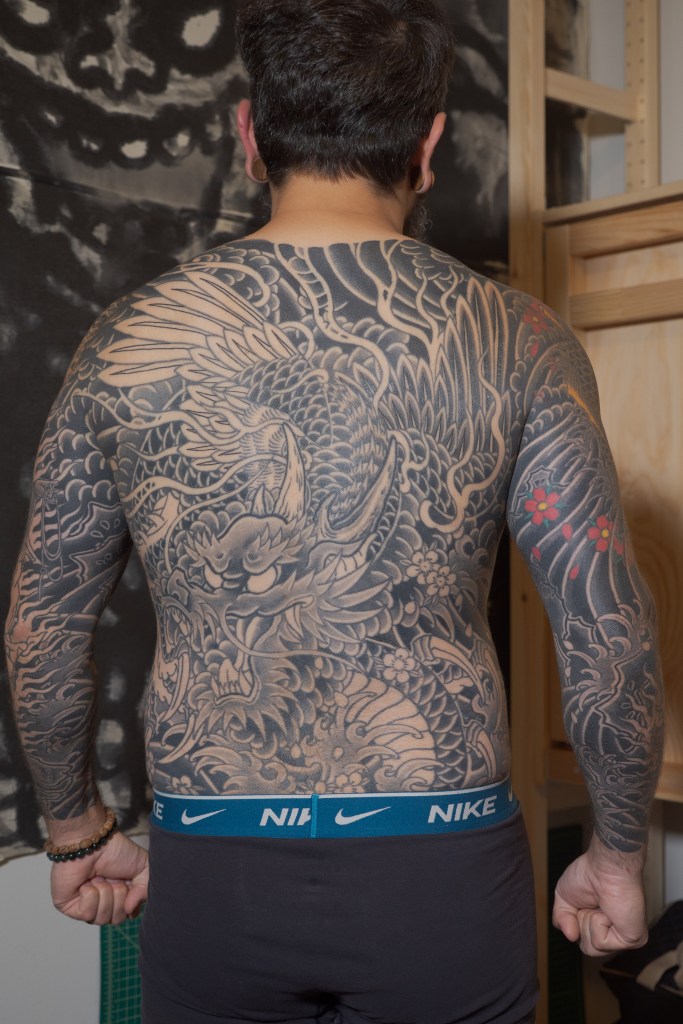 Appointments 140 and 141 have been pretty easy and comfortably routine. Horizakura has continued to shade the dragon’s wings on my back. I don’t really have much more to offer up on these appointments. I think we are getting to be so close to color that I’m not really thinking too deeply about these appointments. It’s exciting to be nearing that milestone, but really I can continue to be patient as things develop. As I type this, I’m gearing up for a weekend at the NYC Tattoo Convention. I have two appointments lined up there as well as some fun other things that I will be posting about here. Until then, have a look at these photos.